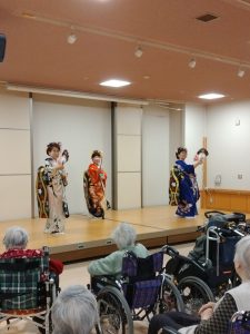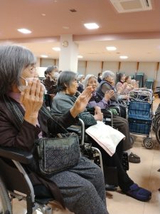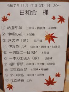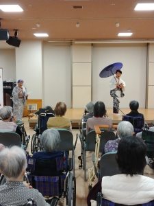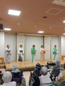 ケアハウス白寿荘西 2025.11.26 日和会様が来荘されました 11月17日、日和会の皆さんが来荘され、歌と踊りを10曲披露してくださいました。 曲ごとに変わる色鮮やかな着物もとても素敵で、ご利用者から大きな拍手とともに 「きれい!」「かわいいよ!」と声が上がります。 「佐渡おけさ」や「花笠音頭」では、ご利用者も手拍子をしたり、「昔は私も踊ったのよ~」と 一緒に手を動かして踊ったりと思い思いに楽しまれていました。 日和会の皆さん、楽しい時間をありがとうございました。またのご来荘をお待ちしております。