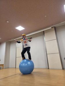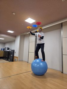 バランスボールに乗りながら、皿回しやけん玉などを次々に披露。