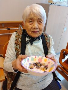 おやつは甘納豆とお茶をいただき、ケアハウスに福を呼び込みました。